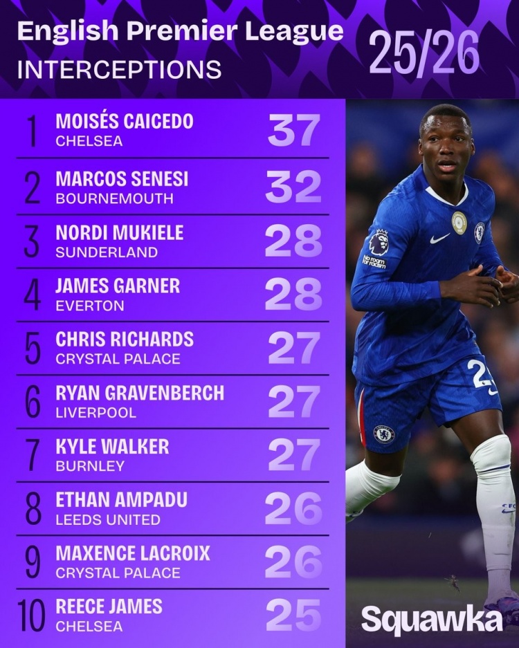 开云品牌-英超成功拦截榜:凯塞多居首,赫拉芬贝赫、沃克、詹姆斯在列